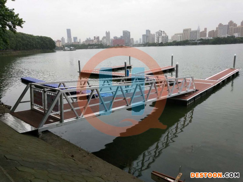 鋼結構浮碼頭,采用模塊化生產(chǎn)加工,組合便捷,施工安裝簡單建設周期短、堅固耐用,穩(wěn)定性良好,維護方便、質(zhì)優(yōu)價廉等諸多優(yōu)勢。所有鋼結構都經(jīng)熱浸鍍鋅,具備良好的耐腐蝕性,適用于江河湖海,通用性強。浮橋兩側各有一條管道,管道由鋁蓋板覆蓋,下鋪管線與電纜,鋁蓋板可輕易打開,便于維護保養(yǎng)與安裝新設施。浮橋組件之間均采用減震系統(tǒng)連接固定。浮箱有混 凝土、滾塑、玻璃鋼等多種類型,內(nèi)填聚苯乙烯泡沫,具有浮力大,穩(wěn)定性強,適應范圍廣等優(yōu)點。鋪板和防撞條可采用原木或塑木安裝,也可加抗紫外線塑料防撞條,各連接件均采用不銹鋼件。