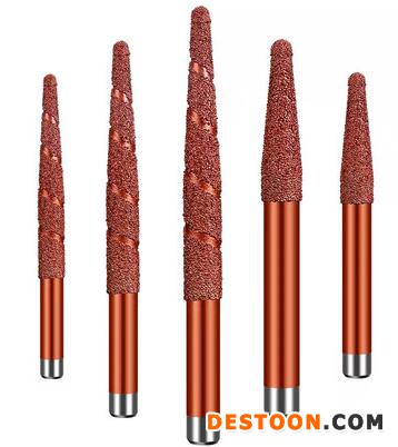 2.釬焊金剛砂雕刻刀系列:主要規格6-2 6-3  8-3  8-4 8-5 8-6 10-3 10-4 10-6 10-8砂高一般從2CM-8CM之間。適合雕刻石材浮雕立體雕刻。浮雕深度從15-80MM之間,優點比較鋒利,缺點耐磨度一般。主要是表層金剛砂。